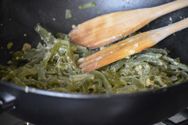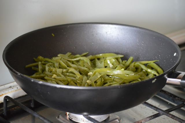Saltei-e o feijão verde deixando-o ficar bem envolvido no azeite.